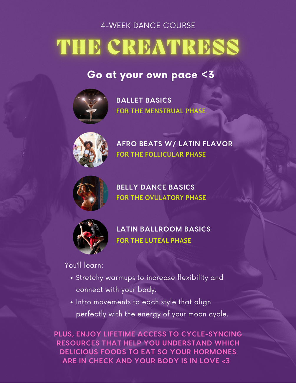 Our incredible feminine bodies move through cycles, just like the moon—why should your workouts be any different? The Creatress is a 4-week dance course designed to help you honor your natural rhythm with the grace of ballet, the vibrancy of Afro beats, the sensuality of belly dance, and the grounding energy of Latin ballroom.